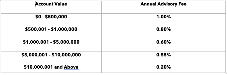 Our annual advisory fees are tiered, meaning when you reach the next level, the next dollar is charged at the lower rate, creating a lower blended rate. Annual fees are charged on a quarterly basis, meaning that every 3 months you will be charged 1/4th of the fee directly from your account.